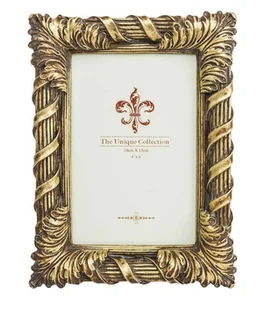 Ramka stylizowana jest na złoty, wiekowy przedmiot pochodzący z czasów arystokracji francuskiej. Ramy wykonane z poliresingu - mieszanki alabastru z masą żywiczną, malowane w odcieniach złota. Piękna ramka retro o ciekawej formie z pewnością będzie przyciągać uwagę. Ramka będzie doskonałą ozdobą, która nada wyjątkowego charakteru wnętrzom klasycznym.