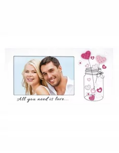 Z prawej strony ramki rysowany słoiczek z serduszkami w tym dwoma jako ozdobami 3D. Pod zdjęciem napis "All you need is love". Ramka do postawienia w poziomie. Idealny pomysł na prezent walentynkowy czy też rocznicowy.