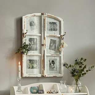 Prawdziwe marzenie miłośników stylu shabby chic. Ta piękna deska dekoracyjna jest idealnym odwzorowaniem nostalgicznego okna. Składa się z bajkowej ramy z drewna sosnowego i wstawek z przezroczystego szkła. Ręcznie wykonane antyczne wykończenie nadaje szlachetnemu wzornictwu piękną patynę i sprawia, że całość wygląda niczym znalezisko z pchlego targu. Dzieło sztuki mogło być również odziedziczone po kochanej babci – po prostu ideał dla wszystkich miłośników vintage.