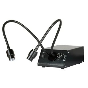Bardzo przydatny przy rejestracji obrazu przy pomocy kamer mikroskopowych, które pracują wydajniej przy większej ilości światła. Dane techniczne: Dwa elastyczne ramiona typu "gęsia szyja", każde o długości 420mm i zakończone silną diodą LED Oświetlenie LED 3W Temperatura barwowa światła: ok. 6500K Natężenie oświetlenia: ok. 6500 lux (przy źródle światła położonym na wysokości 100 mm) Regulowana jasność Wymiary 160mm x 130mm x 70mm (bez giętkich ramion) Żywotność diod:
