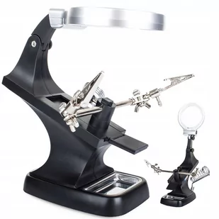 LUPA TRZECIA RĘKA 10 LED UCHWYT LUTOWANIA 3x 4. 5x Profesjonalna trzecia ręka z lupą 3x 75mm oraz 4,5x 20mm to idealne urządzenie dla majsterkowiczów. Może być używana przez Jubilerów, Numizmatyków, Serwisantów elektroniki, zegarmistrzów itp. Posiada silne krokodylki, które mocno trzymają obrabiany przedmiot oraz w pełni regulowane przeguby do żądanego zamocowania przedmiotu. Dzięki dużemu szkle powiększającemu oraz diod 10 x LED, obraz jest bardzo wyraźny i czytelny.