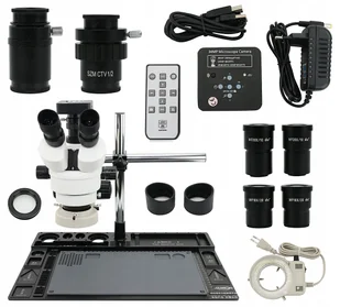 Zastosowanie: lutowanie elektroniki i mikroelektroniki, inspekcja części komputerowych, inspekcja modułu telekomunikacyjnego, inspekcja przemysłowa, inspekcja biżuterii, inspekcja kolekcji monet i innych numizmatów, kontrola drukowania i wydruków, narzędzie do nauki i edukacji, badania laboratoryjne, analiza medyczna, narzędzie do badań szkolnych, badanie owadów, badanie roślin, badanie skóry, kontrola tekstyliów. W zestawie dwa komplety okularów i zabezpieczeniem dolnego obiektywu: okular WF10X/20 2szt (powiększenie 7x do 45x, średnica pola widzenia 20mm) okular WF20X/10 2szt (powiększenie 14x do 90x, średnica pola widzenia 10mm Blat oraz stojan specyfikacja: wymiar blatu: 46,8x32mm, powierzchnia blatu: z otworami na narzędzia i chemię (otwory na topniki 2x55mm, 28 sekcji na śrubki), waga blatu bez stojana: 2,4kg, wysokość stojana: 33mm, długość poziomego ramienia: 28,5cm wielkość maty wysokotemperaturowej z selektorami na śrubki: 323x198mm Kamera Full HD 34Mpix 2.7K - specyfikacja: sensor: 34MPix, powiększenie: 5-krotny zoom cyfrowy, pole widzenia przy powiększeniu 7x: 16mm, pole widzenia przy powiększeniu 45x: 2,2mm, dostępna rozdzielczość video: 2.7K (2560x1440 30FPS), 2.5K (2304x1296 30FPS), 1080P (1920x1080 60FPS) dostępna rozdzielczość foto: 34MP (6800x5100), 21MP (5200x3900), 16MP (4608x3456) interfejs: HDMI Full HD, USB, funkcje regulacji obrazu: regulacja balansu bieli, ekspozycji, ostrości, kolorów, kontrastu, włączenie precyzyjnej linijki w osi X i Y, zarządzanie kartą MicroSD i odtwarzanie nagrań, interfejs sterowania kamerą: pilot IR, mocowanie do obiektywu: gniazdo C-Mount, obsługa kart MicroSD do 256GB, wymiary: 73x73x30mm, menu w języku angielskim, możliwość rejestracji filmów (mp4) i zdjęć (jpeg), możliwość pomiaru rozmiaru elementów. Kamera pozwala na jednoczesne: przekazywanie obrazu przez złącze HDMI na ekran monitora Full HD, rejestrację obrazu przez port USB za pomocą dołączonego oprogramowania z pomiarem wielkości elementów, zapis filmów i zdjęć z poziomu kamery na karcie MicroSD. Najwyższej jakości kamera umożliwiająca wykonywanie zdjęć i nagrywanie filmów obiektów mikro...