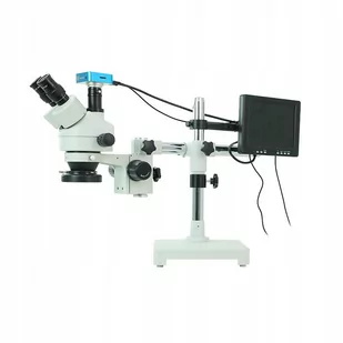Mikroskop z długim filarem 40cm STL+A1 + Głowica 7-45x + Kamera 616 16MP HDMI&USB HD + wyświetlacz 8 cali + Oświetlenie 60xLED Niezawodny mikroskop, wyposażony w trzy-okularową głowicę nachyloną pod kątem 45 stopni. Zastosowanie trzy-okularowej głowicy pozwala na prowadzenie długich obserwacji bez niepotrzebnego napinania mięśni oraz zmęczenia wzroku (w porównaniu z mikroskopami monokularowymi). Układ optyczny tego modelu został wykonany z wysokiej jakości szkła pokrytego specjalną powłoką, dzięki czemu obraz jest ostry, a kolory – naturalne. Najwyższej jakości optyczne elementy szklane, zakres zoomu 7x-45x. Obrotowa głowica z możliwością obrotu o 360 °, bardzo duża odległość robocza zapewnia wystarczającą przestrzeń do pracy.