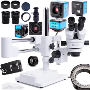 Mikroskop trinokularowy Techrebal 10HW 7-45X + Oświetlenie 56x LED + Soczewka Barlowa 0,5 + Wyświetlacz 10 cali + Kamera Techrebal T250 5MP + Uchwyt wyświetlacza Profesjonalny mikroskop trinokularowy Techrebal 10HW 7-45X, idealny do precyzyjnych badań i obserwacji. W zestawie znajduje się między innymi oświetlenie 56x LED, Kamera do mikroskopu Techrebal T250 5MP oraz soczewka Barlowa 0,5, co zapewnia doskonałe warunki oświetleniowe i zwiększoną optyczną powiększalność. Doskonałe narzędzie dla laboratoriów, szkół i hobbystów. Wysoka jakość wykonania i niezawodność. Mikroskop trinokularowy Techrebal 10HW 7-45X 10HW to niezawodny mikroskop stereoskopowy, wyposażony w trinokularową głowicę, nachyloną pod kątem 45 stopni.