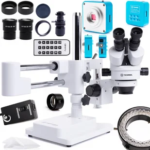 Mikroskop trinokularowy Techrebal 10HW 7-45X + Oświetlenie 56x LED + Barlowa 0,5 + Wyświetlacz 10 cali + Kamera Techrebal "Blue waterfall" 16MP + Uchwyt wyświetlacza Profesjonalny mikroskop trinokularowy Techrebal 10HW 7-45X, idealny do precyzyjnych badań i obserwacji. W zestawie znajduje się między innymi oświetlenie 56x LED, Kamera do mikroskopu Techrebal "Blue waterfall" 16MP oraz soczewka Barlowa 0,5, co zapewnia doskonałe warunki oświetleniowe i zwiększoną optyczną powiększalność. Doskonałe narzędzie dla laboratoriów, szkół i hobbystów. Wysoka jakość wykonania i niezawodność. Mikroskop trinokularowy Techrebal 10HW 7-45X 10HW to niezawodny mikroskop stereoskopowy, wyposażony w trinokularową głowicę, nachyloną pod kątem 45 stopni.