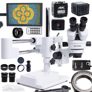 Mikroskop trinokularowy Techrebal 10HW 7-45X + Oświetlenie 56x LED + Barlowa 0,5 + Wyświetlacz 10 cali + Kamera Techrebal Black PRO 4K 8mp + Uchwyt wyświetlacza Profesjonalny mikroskop trinokularowy Techrebal 10HW 7-45X, idealny do precyzyjnych badań i obserwacji. W zestawie znajduje się między innymi oświetlenie 56x LED, Kamera do mikroskopu Techrebal Black PRO 4K 8mp oraz soczewka Barlowa 0,5, co zapewnia doskonałe warunki oświetleniowe i zwiększoną optyczną powiększalność. Doskonałe narzędzie dla laboratoriów, szkół i hobbystów. Wysoka jakość wykonania i niezawodność. Mikroskop trinokularowy Techrebal 10HW 7-45X 10HW to niezawodny mikroskop stereoskopowy, wyposażony w trinokularową głowicę, nachyloną pod kątem 45 stopni.
