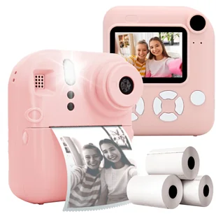 Aparat natychmiastowy z modułem selfie różowy Specyfikacja: Napięcie wejściowe: 5 V= 1 A Bateria: Li-ion: 3,7 V 1200 mAh; 4,44 Wh Ekran: 2. 4" IPS Port ładowania: