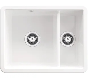 Ceramiczny zlewozmywak 1.5-komorowy, biały, 555x430mm, błyszczący, wpuszczany/podwieszany, odporny na temperatury, elegancki design