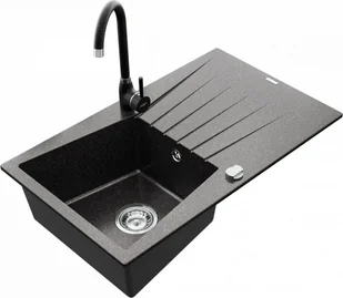 Zlewozmywak Mexen Cesar granitowy 1-komorowy z ociekaczem i baterią kuchenną Telma, czarny nakrapiany - 6514-76-670200-76