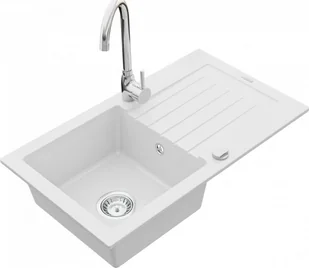Zlewozmywak Mexen Pablo granitowy 1-komorowy z ociekaczem i baterią kuchenną Telma, biały - 6510-20-670200-00