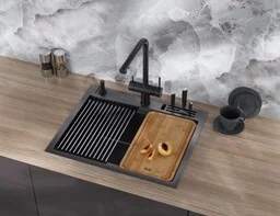 Proces produkcyjny znacznie zwiększa wartość każdego modelu, grubość metalu, jakość, wygląd i redukcję hałasu. 3. Grubość zlewozmywaka kuchennego do 3 mm Zlewozmywak wykonany jest z najwyższej jakości stali nierdzewnej o minimalnej grubości 1,5 mm w najcieńszym miejscu i 3 mm grubości podstawowej. 4. Łatwość pielęgnacji zlewozmywaków Wewnętrzne zaokrąglone narożniki zlewu z ociekaczem ułatwiają mycie zlewu przy niewielkim wysiłku. 5. Dźwiękochłonność zlewu kuchennego Zlewozmywak ze wszystkich stron jest oklejony matą wygłuszającą. Podczas użytkowania zlew nie będzie hałasował od spadającej wody, jak podczas korzystania z cienkościennego zlewu.