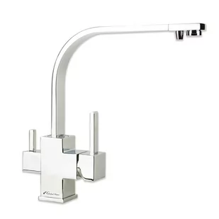 Nowoczesna bateria kuchenna z podłączeniem do ciepłej i zimnej wody użytkowej oraz wody filtrowanej.
