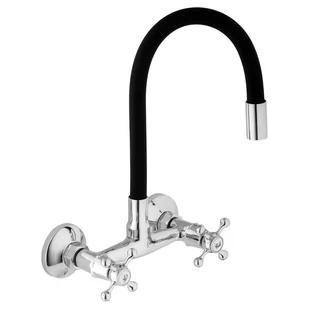 Bateria kuchenna ścienna dwuuchwytowa – czarna Mechaniczna bateria zlewozmywakowa, ścienna, dwuuchwytowa. Posiada długą, elastyczną wylewkę w kolorze czarnym, która daje możliwość nie tylko szybkiego opłukiwania naczyń czy umycia zlewu, ale również wygodnego napełnianie garnków wodą. Bateria posiada perlator, który doskonale napowietrza oraz zmiękcza strumień wody. Rozwiązanie to znacząco wpływa na zużycie wody, co oznacza niższe rachunki domowe. Najważniejsze cechy ✔ Długa, elastyczna wylewka w kolorze czarnym ✔ Perlator O2 - duża oszczędność wody i mniej zacieków z kamienia na naczyniach ✔ Przyłącze 1/2 cala ✔ Całkowita długość wyprostowanej wylewki wynosi aż 50 cm ✔ Nowoczesny, minimalistyczny design Specyfikacja Marka:
