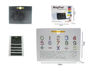 Tablica magnetyczna z kulkami. Zabawa polega na rysowaniu załączonym rysikiem z magnesem (przy dotknięciu rysika do tablicy - wysuwają się kuleczki - powstają napisy lub obrazki). W zestawie są także szablony. Wymiary opakowania: 32x26,5x2,5 cm.