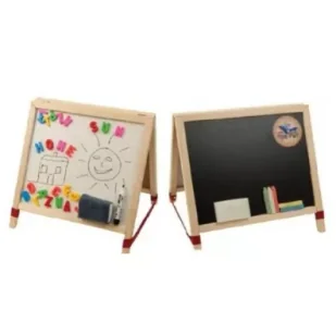 Drewniana dwustronna, magnetyczna, rozkładana tablica. Wyposażona w zegar, a w nim ruchome wskazówki. Gąbka wraz z polarem do wycierania markera i 5 kolorów kredy. Do tablicy dołączany jest marker oraz przemiennie zestaw magnetycznych liter i cyfr.