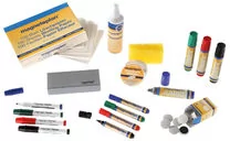 akcesoria do tablic suchościeralnych i flipchart 1 kpl markerów suchościeralnych (czarny, czerwony, niebieski, zielony) do bialych tablic i papierów Flip Chart; końcówka okrągła (nr kat 12281) 1kpl markerów flipchart 4 kol 1kpl markerów Jumbo do tablic Flipchart 4 kol 1 szt wycieracz do tablic suchościeralnych, gąbka ( nr kat 12295) 10 szt magnesy discofix standard, fi - 30 mm 1 szt płyn do czyszczenia tablic w areozolu 250 ml ( nr kat 12 300); 1 op środek czyszczący (gdy pomyłkowo użyjemy markera permanentnego) do bialych tablic z gąbką ( nr kat 12297) 100 szt platków czyszczących ( nr kat 12296) zastosowanie: uczelnie, szkoły, biura, zabawy w domu przeznaczenie: tablice suchościeralne, szkło, śliski papier produkt niemieckiej firmy Magnetoplan