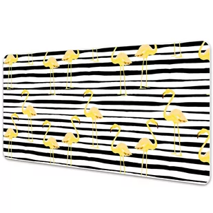 Podkładka na biurko Złote flamingi na geometrycznym tle 90x45 cm Podkładka winylowa na biurko to nie tylko praktyczny dodatek, ale także dekoracyjny element, który subtelnie podkreśli styl każdego pomieszczenia, bez względu na wiek czy charakter. Każdy blat, na którym zdecydujesz się położyć naszą wyjątkową podkładkę, nabierze nowego wymiaru estetycznego, wzbogacając zarówno przestrzeń dziecięcego pokoju, jak i eleganckiego biura. Wygląd naszej podkładki winylowej jest rezultatem precyzyjnego, cyfrowego druku, który podkreśla intensywność kolorów i detalii wzoru. Po rozłożeniu maty możesz spokojnie pracować, nie martwiąc się o niechciane rysy czy inne uszkodzenia. Mata jest niezwykle wytrzymała i solidna.