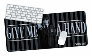 mnie! Idealna dla każdego, kto w głębi serca jest małą Wednesday - lub chciałby nią być. Materiał: tkanina, wymiary: ok. 70 cm x 30 cm. Zanurz się w mrocznie uroczym świecie Wednesday Addams dzięki tej nieodpartej podkładce na biurko, która przegoni nawet najbardziej szare biurowe smutki! Idealna dla fanów kultowej serii Wednesday lub każdego, kto chce dodać odrobinę gotyckiego stylu do swojego miejsca pracy. Elegancki czarno-niebieski design z kultowym sloganem GIVE ME A HAND w magiczny sposób przyciąga uwagę, podobnie jak sama Wednesday.