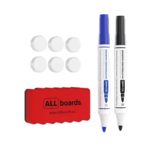 Zestaw akcesoriów do tablic suchościeralnych Zestaw składa się z: gąbki magnetycznej, dwóch markerów suchościeralnych, 6 białych magnesów. Magnesy nie są przeznaczone do użytku z tablicami szklanymi magnetycznymi.