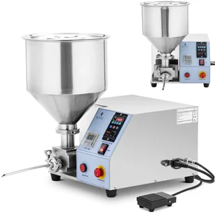 Szybkość napełniania wynosi 0 - 99 s. Maszynę do napełniania uruchomisz pedałem nożnym, delikatnie dociskając go stopą. Masa jest precyzyjnie wyciskana z pojemnika porcjami. Nadziewarka do pączków jest wykonana ze stali nierdzewnej i dlatego jest szczególnie łatwa w utrzymaniu i czyszczeniu. Tylko podstawa jest wykonana z aluminium.