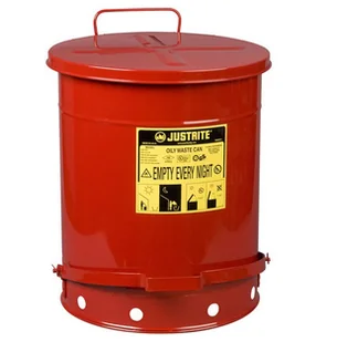 kolor - ochrona zakładu pracy - kosze na odpady: czerwony, otwieranie: ręczne, pojemność - ochrona zakładu pracy - kosze na odpady: 52 l. , Stalowy pojemnik firmy JUSTRITE na odpady niebezpieczne z samozamykającą się pokrywą oraz dźwignią nożną, doskonały do składowania odpadów niebezpiecznych: szmaty i ściereczki nasączone rozpuszczalnikami, rozcieńczalnikami, olejami, smarami, łatwopalnymi klejami i innymi niebezpiecznymi cieczami.