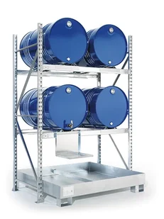 Do regału można dokupić przenośną dostawkę na pojemnik, której wymiary współgrają z wbudowaną wanną ociekową, która ma na celu wychwytywanie ewentualnych wycieków powstałych tak w wyniku rozszczelnienia czy uszkodzenia beczki, czy podczas napełniania pojemników. Konstrukcja z solidnego materiału ocynkowanego cechuje się wysoką odpornością na uszkodzenia i odkształcenia. Grubość blachy to 3 mm. Nośność przy równomiernym obciążeniu minimum 3 pól to 1200 kg, co znaczy, że regał podstawowy z dwoma regałami dostawnymi posiada taką właśnie nośność maksymalną. Nośność poszczególnych półek to 600 kg.