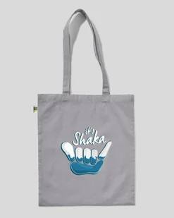 Torba bawełniana na zakupy dla miłośników surfingu. Nadruk na torbie na zakupy przedstawia gest pozdrowienia surferów i napis „It’s Shaka”. Bawełna z certyfi...
