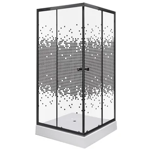 Kabina natryskowa z brodzikiem 88 x 88 x 180 cm – bez brodzika 90 x 90 x 195 cm – z brodzikiem Profile: aluminiowe, czarne Drzwi: dwuskrzydłowe, przesuwne Szkło: 4 mm, hartowane, transparentne z dekorem Brodzik : akrylowy, biały - szerokość wejścia: