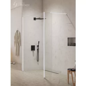Ścianka prysznicowa typu WALK IN 130 cm ze ścianką boczną New Modus White New Trendy. Kabina wyposażona jest w bezpieczne, hartowane szyby o grubości 8mm, z powłoką ochronną Active Shield. Kolekcja objęta 7-letnim okresem gwarancji. Kabina może być montowana zarówno z brodzikiem jak i bez.