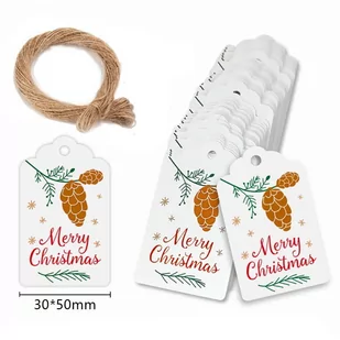 Etykieta Tekturowa Ze Sznurkiem Merry Christmas 5 szt. Zawieszki tekturowe ze sznurkiem, świetnie do przyozdobienia wszelkiego rodzaju prezentów, produktów, rękodzieł i innych przedmiotów. Wymiar etykiety: 3x5 cm UWAGA! Oferta nie zawiera całej szpulki sznurka. W zestawie 5 pasków sznurka, każdy o długości około 25-26 cm.