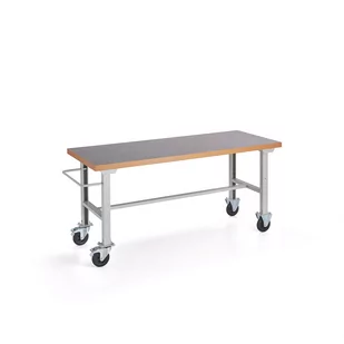 Stół roboczy z regulacją wysokości i wygodnym uchwytem. Powierzchnia robocza pokryta jest winylem. Stół sprawdzi się na stanowiskach pakowania i montażu, gdyż jest miękki i posiada właściwości antypoślizgowe. Dodaj sprytne akcesoria i stwórz kompleksowe rozwiązanie do pracy. Stwórz mobilne stanowisko pracy dzięki trwałemu i funkcjonalnemu stołowi na kółkach. Blat wykonano z płyty wiórowej wykończonej winylem. Ten typ blatu jest polecany w szczególności na stanowiska pakowania i montażu. Powierzchnia jest gładka i miękka, co zmniejasza ryzyko uszkodzenia obrabianych przedmiotów. Winylowy blat jest odporny na rozpuszczalniki. Nie należy po nim pisać. Rama wykonana ze stali malowanej proszkowo na szaro. Wykończenie lakierem proszkowym zapewnia optymalną wytrzymałość i odporność na uderzenia. Ręczna regulacja wysokości nóg pozwala podnosić i opuszczać blat, co ułatwia znalezienie optymalnej wysokości roboczej.