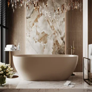 Massi Wanna wolnostojąca owalna z konglomeratu 160 x 75 cm RONA Beige mat / połysk przelew typu SLIM cienki rant