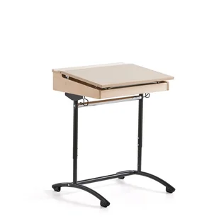 Ławka szkolna z powierzchnią laminowaną wysokociśnieniowo. Blat jest nachylony pod kątem około 5°. Można go unieść, aby był ustawiony na płasko, korzystając ze wspornika znajdującego się wewnątrz. Biurko posiada mechanizm regulacji wysokości i jest wyposażone w dwa haczyki. Klasyczna ławka dla ucznia z trwałą powierzchnią na pokrywie, która wytrzyma trudne warunki szkolne.