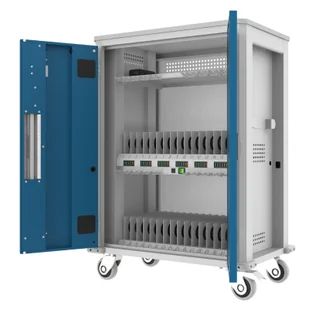 Solidna, metalowa konstrukcja wózka skutecznie chroni elektronikę przed zniszczeniem, zalaniem, a nawet ewentualną kradzieżą. Przechowywane w szafce sprzęty zabezpieczane są także nowoczesnym zamkiem kluczowym z podwójną blokadą. Każda z przegródek numerowana. Wózki przystosowane są do pracy z napięciem ~230V. Dla zwiększenia bezpieczeństwa zastosowany został układ utrzymujący niskie obciązenie instalacji elektrycznej wózka podczas włączania.
