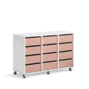 Mobilny mebel do przechowywania papieru, ołówków, książek i innych materiałów szkolnych. Mebel oferuje wiele szuflad, które pomieszczą papier w formacie A4. Wykonany z wytrzymałego laminatu i wyposażony w blokowane koła. Mobilny regał służy jako świetne miejsce do przechowywania w salach lekcyjnych. Pojemna konstrukcja mebla umożliwia przechowywanie wielu rzeczy na niewielkiej przestrzeni. Przydziel wszystkim uczniom własną szufladę do przechowywania bloków do pisania, książek, długopisów itp.