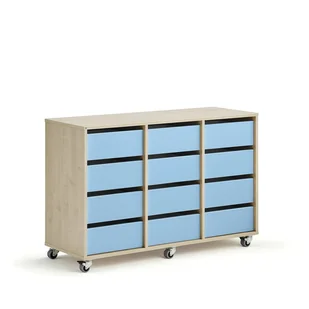 Mobilny mebel szkolny do przechowywania papieru, długopisów, książek i innych materiałów szkolnych. Mebel oferuje szuflady, które pomieszczą papier w formacie A4. Wykonany z wytrzymałego laminatu i wyposażony w koła z blokadą. Mobilny regał służy jako doskonały mebel do przechowywania rzeczy osobistych uczniów w salach lekcyjnych. Jego kompaktowa i pojemna konstrukcja umożliwia przechowywanie wielu rzeczy na niewielkiej powierzchni. Przydziel uczniom własną szufladę do przechowywania papieru, ołówków, książek i nie tylko.
