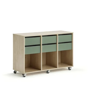 Posiada otwarte półki i funkcjonalne szuflady na papier, książki, ołówki i podobne materiały szkolne. Uczniowie mogą dzielić przegrody lub można je przypisać każdemu uczniowi z osobna. Mebel idealnie spełnia swoje zadanie również jako tradycyjna jednostka do przechowywania dla całej klasy.