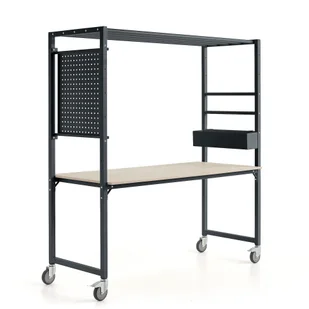 Wielofunkcyjny stół na kołach, który można wykorzystać do pracy przy projektach, do spotkań, przerw kawowych itp. Blat można ustawić na czterech różnych wysokościach. Zawiera praktyczny panel na narzędzia i skrzynkę na akcesoria do przechowywania akcesoriów biurowych itp. Wielofunkcyjny stół doskonale sprawdzi się do prac kreatywnych osób w biurze, ale idealnie nadaje się też do szkoły, stołówki, kawiarni itp. Wybierz wysokość stołu odpowiadającą Twoim potrzebom. Niezależnie od tego, jaką wysokość wybierzesz, przy stole można wygodnie siedzieć lub stać. Ponieważ stół jest wyposażony w koła, w razie potrzeby można go łatwo przesunąć.