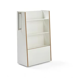 Wózek na książki jest dostępny w wersji jedno- i dwustronnej i ma prosty skandynawski design, z białymi bokami z wysokociśnieniowego laminatu i dębowymi krawędziami. Koła są ukryte, a po obu stronach znajdują się uchwyty ułatwiające przemieszczanie wózka. Wózek na książki jest wyposażony w półki z blachy stalowej, które są lekko pochylone do tyłu. Taki kąt nachylenia sprawia, że książki pozostają na swoim miejscu podczas przechowywania i transportu.