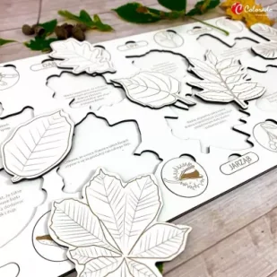 Na tablicy precyzyjnie laserowo wygrawerowane są liście drzew wraz z ciekawostkami oraz owocem każdego z nich. Liście, owoce i nazwy drzew wycięte laserowo tworzą puzzle do włożenia na tablicę. Zestaw zawiera 25 elementów w tym: drewnianą tablicę z wyciętymi liśćmi, owocami i nazwami drzew oraz wygrawerowanymi ciekawostkami dotyczącymi każdego z nich,8 puzzli liści z wygrawerowanym ich wyglądem,8 puzzli przedstawiających owoc danego drzewa,8 puzzli z nazwą danego drzewa. Wymiary: 49 cm x 27 cmDrewniana tablica liście i owoce drzew jest niezastąpioną pomocą dydaktyczną do nauki w przyjazny i przejrzysty dla dziecka sposób.