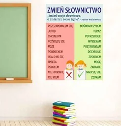 Naklejka dekoracyjna na ścianę do szkoły. Naklejka dekoracyjna na ścianę z propozycjami zwrotów jakich można używać by zmienić swe słownictwo na lepsze.