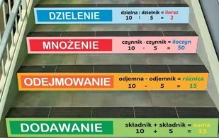 Rewelacyjne,kolorowe naklejki na schody. Zestaw składa się z 4 naklejek z działaniami matematycznymi, jej opisem oraz zrozumiałymi przykładami. Czytelnie skonstruowane treści na tematycznym tle pomogą w przyswajaniu wiedzy. Pojedyncza naklejka ma rozmiar 100x10cm. Naklejki przeznaczone są do przyklejania na podstopnice schodów czyli na ich pionową część, aby były dobrze widoczne dla osób wchodzących po schodach.