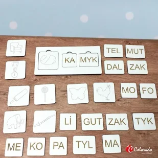 Ilość: 27 elementów: 9 płytek z obrazkami (lizak, mazak, kogut, motyl, fotel, patyk, mamut, medal, kamyk), 17 płytek z sylabami otwartymi prymarnymi i zamkniętymi oraz podstawą bazową,