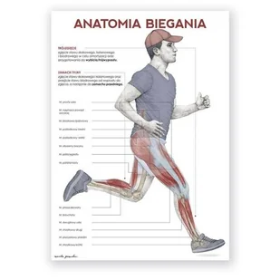 Plakat anatomiczny przedstawiający pracę mięśni podczas biegania zawiera grafikę autorstwa popularnej wśród fizjoterapeutów Marty Pawelec. Estetyczny projekt jest utrzymany w nowoczesnej i minimalistycznej stylistyce, która będzie pasowała do niemal każdego wnętrza. Plansza anatomiczna ma wymiary 50cm x 70cm, które odpowiadają popularnemu i uniwersalnemu formatowi B2. Plakat do gabinetu posiada podpisy poszczególnych elementów układu mięśniowego, które są zaangażowane podczas biegania oraz krótki opis ich pracy. Wszystkie opisy na tablicy są w języku polskim.