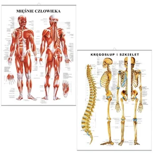 Zestaw plansz anatomicznych mięśni i szkieletu człowieka może być praktycznym elementem wyposażenia gabinetów medycznych lub sal dydaktycznych. W skład zestawu wchodzą dwa plakaty, jeden z nich przedstawia układ mięśniowy, a drugi kręgosłup i szkielet. Obie plansze anatomiczne mają wymiary 85cm x 60cm. Ilustracje są bardzo szczegółowe i poprawne anatomicznie oraz posiadają liczne opisy zgodne z mianownictwem polskim. Dodatkową zaletą produktów są metalowe haczyki, które ułatwiają wygodne i szybkie zawieszenie.