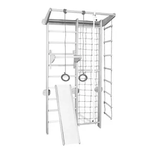 Dane Techniczne: ELEMENTY ZESTAWU drewniana drabinka siatka wspinaczkowa drążek nieprzesuwny drążek dodatkowy zjeżdżalnia drabinka linowa kółka gimnastyczne lina gimnastyczna WAZNE Dopuszczalne obciążenie: drabinki i drążka - 100 kg, akcesoriów zawieszanych - 60 kg, drążka dodatkowego: 60 kg, zjeżdżalni - 50 kg Wysokość drabinki: 225 cm Szerokość drabinki: