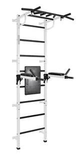 Metalowe szczeble w eleganckim czarnym kolorze nadają konstrukcji nowoczesny wygląd. Gumowane szczeble zapewniają pewny chwyt i dodatkowe bezpieczeństwo. Odporna na ścieranie powłoka proszkowa zapewnia trwałość i estetyczny wygląd przez wiele lat. Plastikowe zaślepki na końcach chronią powierzchnie przed zarysowaniami. Wszechstronny zestaw, który spełnia potrzeby zarówno początkujących, jak i zaawansowanych ćwiczących i promuje rozwój siły, koordynacji i wytrzymałości.