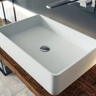 Prostokątna umywalka nablatowa o nowoczesnym, prostym kształcie, wykonana z wysokiej jakości odlewu mineralnego Pure Acrylic. Umywalka w kolorze matowej bieli jest solidna, łatwa do czyszczenia, odporna na działanie ciepła i kolorów.