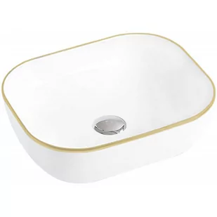 Dane techniczne: Rozmiar: 50x40,5x14,5 cm Typ: Nablatowa Kolor: Biało/Złoty Otwór przelewowy: Nie Otwór na baterie: Nie Materiał: Ceramika sanitarna