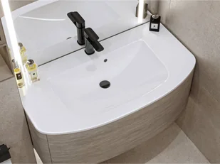 Umywalka z lanego marmuru DEA 1000 zaprojektowana w kształcie półksiężyca. Szerokie skrzydełka na kosmetyki do pielęgnacji i duża prostokątna misa stworzą ko...